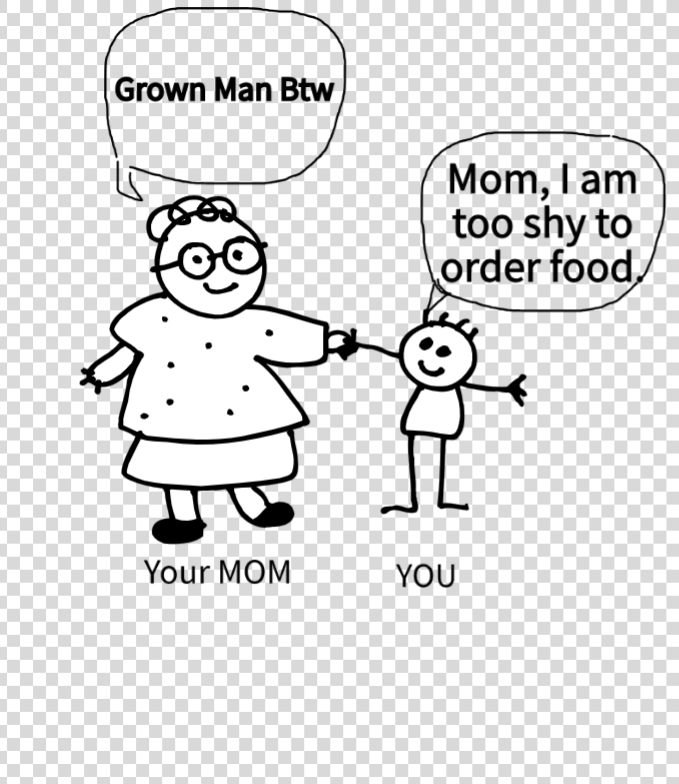 You’re at a restaurant, but you’re too shy to order food yourself. So, you ask your mom to do it for you. She talks to the waiter, and the waiter finds you a table.